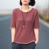 夏季新款 简约休闲拼色螺纹亚麻针织衫T恤女圆领中袖打底衫