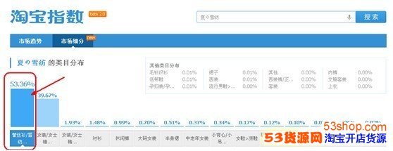 那卖家如何才能知道关键词是和哪个类目最相关性呢?还是用这个关键词来做案例,打开淘宝指数,输入关键词,选择市场细分页面,就可以看到如下界面: