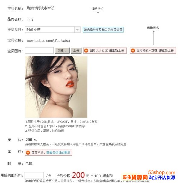 宝贝名称、品牌名称、宝贝图片、原价、库存、邮费。